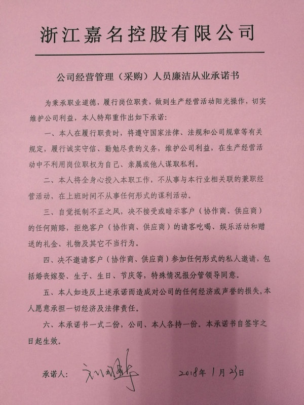 1月23日,公司召開經營管理(采購)人員廉潔從業承諾書簽訂會議,11名公司廉潔風險重點崗位的經營管理(采購)人員參加會議,并簽訂了廉潔從業承諾書。公司莫總和黨建指導員吳紀聯分別講話。